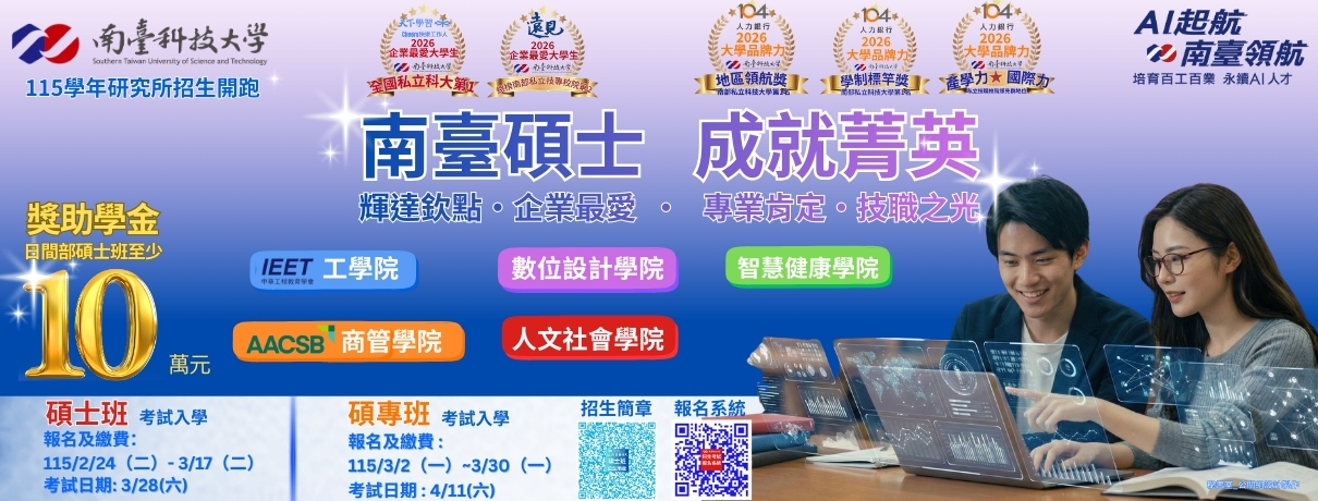 AI 起航 南臺成就菁英!南臺科大 115 學年研究所招生強勢開跑 蟬聯企業最愛全國私立科大第一 祭出「入學獎助學金 10 萬起」力挺學子晉升 AI 高階人才